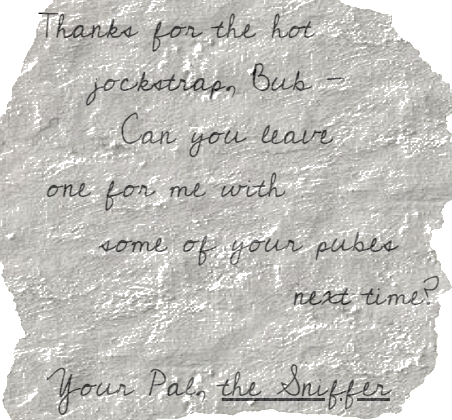 Reports are surfacing in the gossip mills across the Loveless Motel empire, amidst a rash of new missing jockstraps. Bunkhouse men just barely miss the guy in the act - a shadowy figure whose actions in silhouette suggest a heist in progress - a dick imprint and a fingered signature on the window of the steam room of The Tubs, a cryptic note left on a bench in the lockerroom there.....